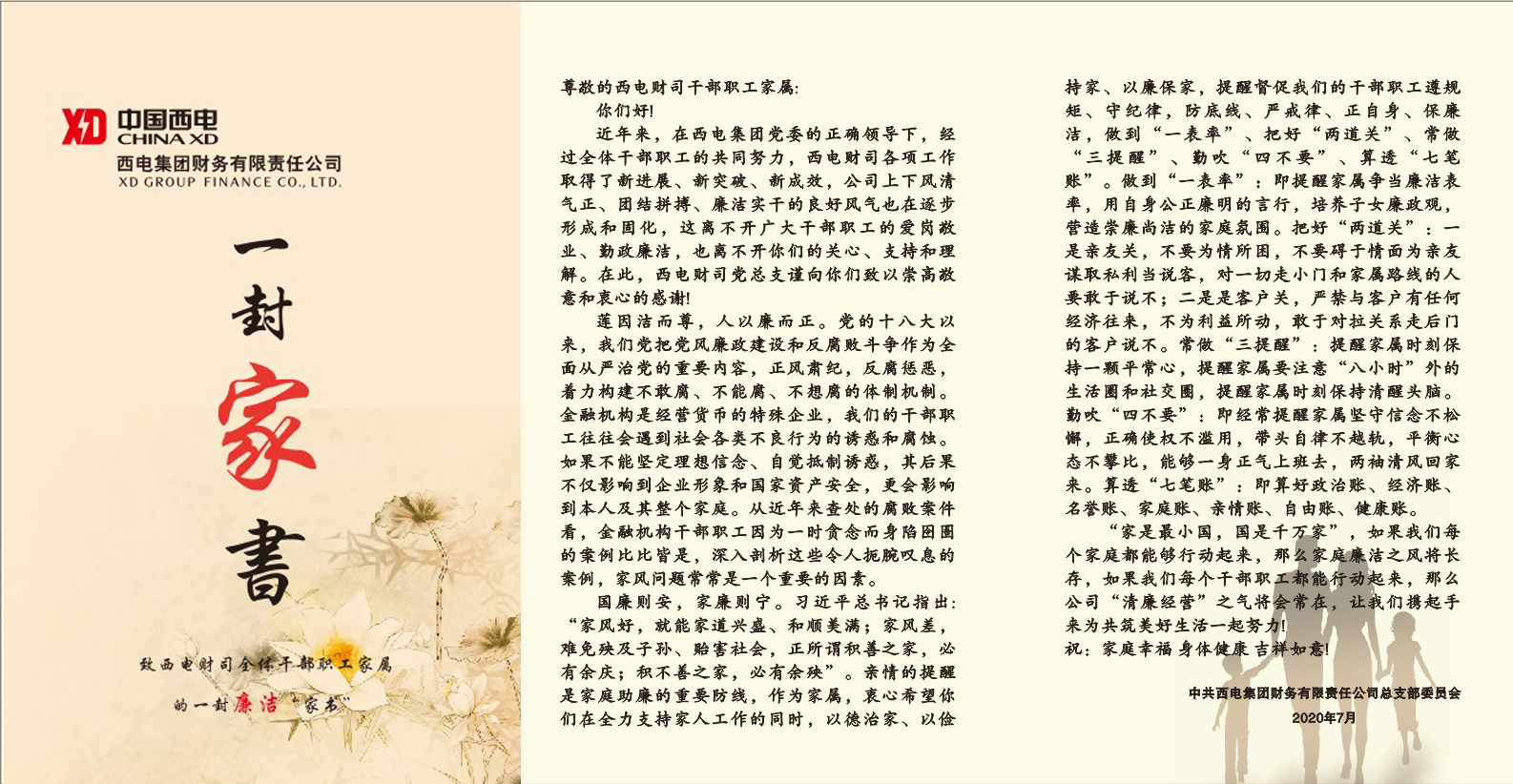 2020年是陕西银保监局确定的清廉金融文化建设推进年,公司专题学习研究部署,及时制定工作方案,发起清廉金融文化倡议。活动中,西电财司班子成员向全体干部职工分发了《廉洁“家书”》,将一份“廉情”传递给干部职工及家属,寄托良好祝愿和殷切希望。